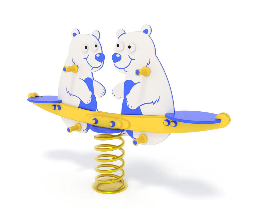 Gioco a molla a due posti a forma di Orsetto, realizzato con una sagoma in polietilene HDPE bicolore e con due sedute. Con molla da 20mm in acciaio, certificato secondo norma EN 1176:2018, ideale per parchi pubblici, privati e ristoranti. Possibilità di fissaggio sia su cemento che su terreno naturale.